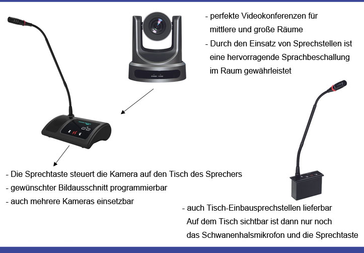 - Die Sprechtaste steuert die Kamera auf den Tisch des Sprechers